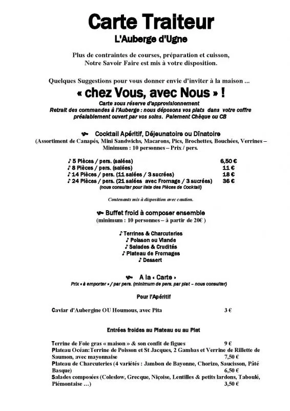 Envie de partager un moment en famille ou entre amis ... et de vous régaler autour des saveurs de la cuisine de l'Auberge d'Ugne ! Voici notre nouvelle Carte Traiteur disponible à ce jour.