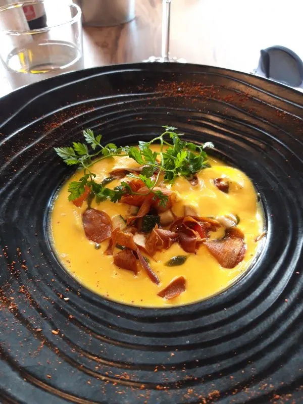 mais aussi la Pintade en cuisson basse température & son Ecrasé de Patates douces, Compotée de Choux, la Gauffre tiède Saumon fumé et crème fouettée au citron vert, le Velouté de Butternut & ses mouillettes au Confit de Figues et Foie gras ...