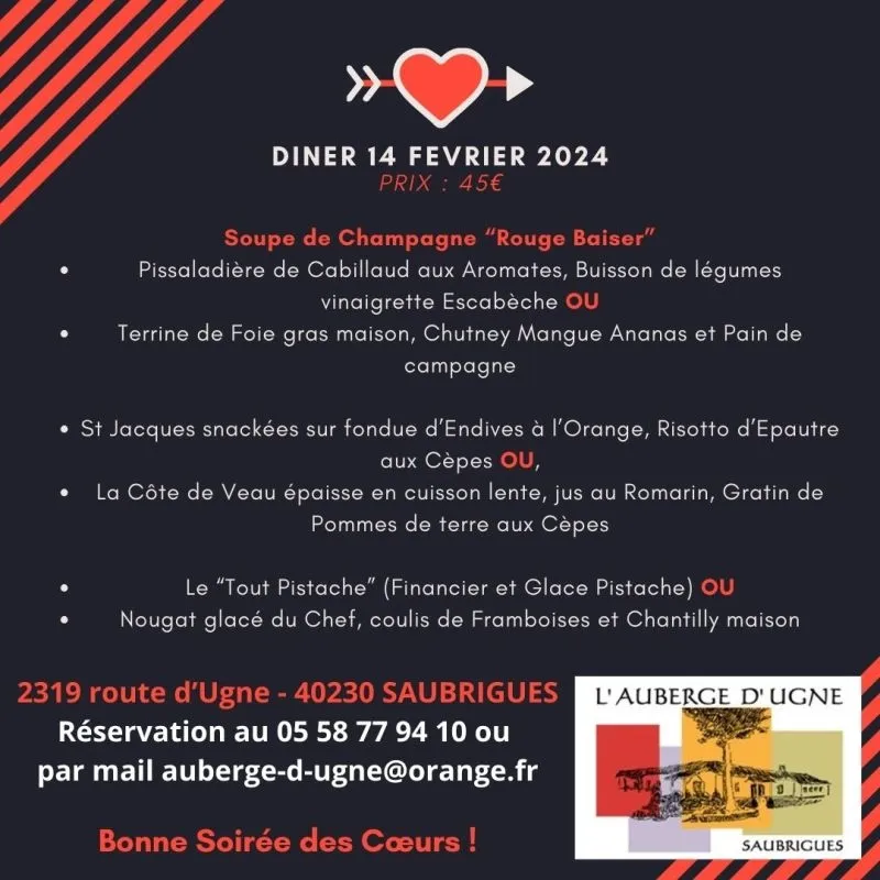 Voici le délicieux programme proposé à l'Auberge pour cette Soirée des Valentines et des Valentins.